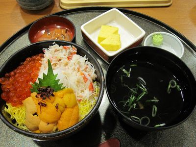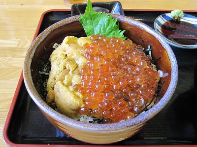 ランチは駅前の朝市横丁内「いくら亭」でミニうにいくら丼1200円(たぶん)。