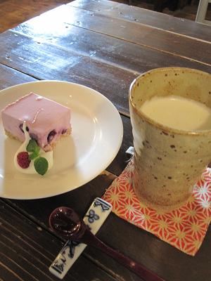 ブルーベリーのレアチーズケーキとほうじ茶のミルクティー。